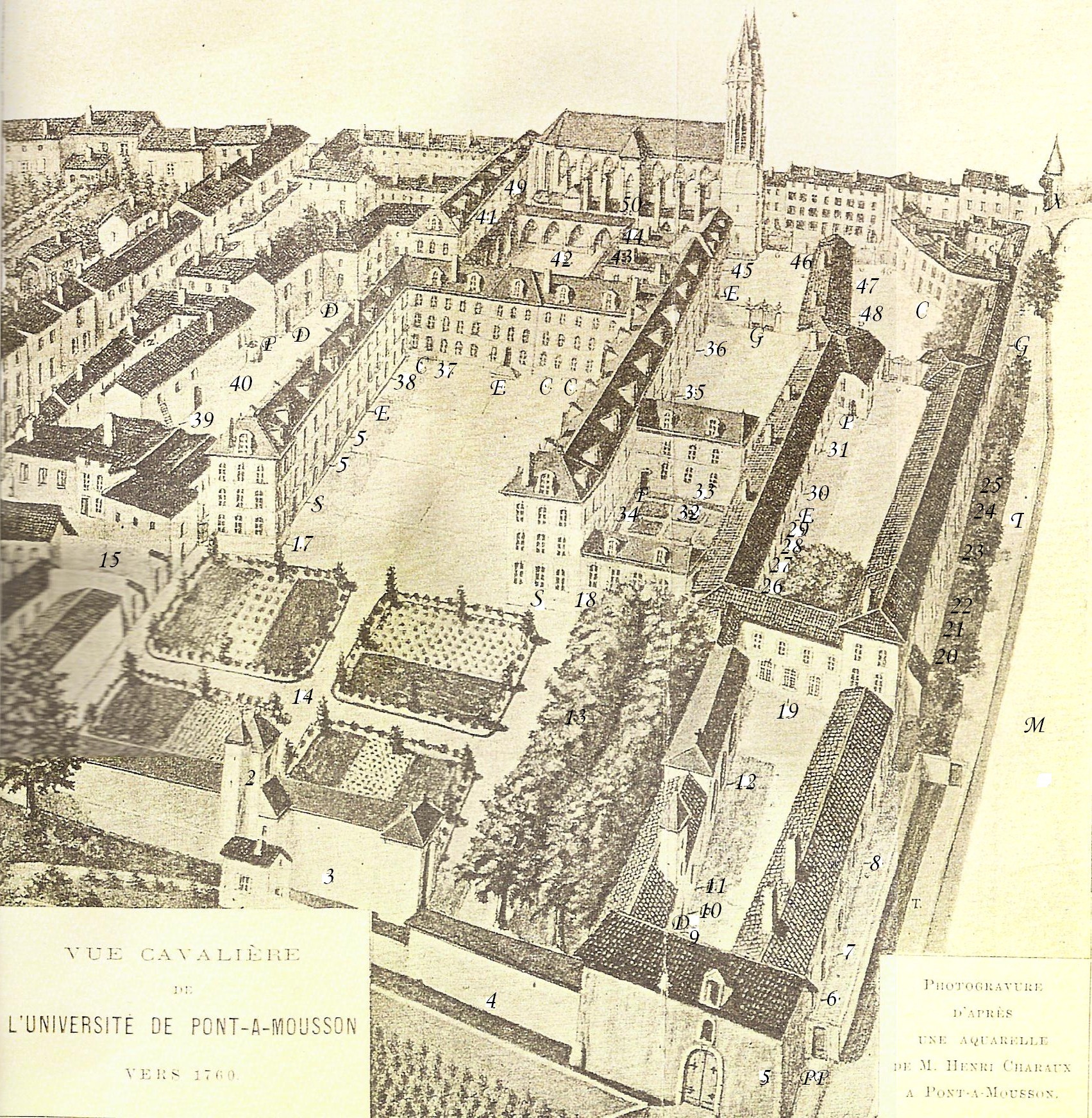 1 : Ancienne église Saint-Martin (supprimer sur cette gravure) 2 : Observatoire 3 : Galerie 4 : Serres 5 : Grange aux dîmes 6 : Dépense 7 : Cuisine 8 : Réfectoire du pensionnat 9 : Hangar 10 : Colombier 11 : Sacristie 12 : Chapelle de la Congrégation 13 : L’allée des tilleuls 14 : Potager 15 : Serres 16 : Ecurie et remise 17 : Menuiserie 18 : Muséum 19 : Grande salle des Actes 20 : Rhétorique 21 : Physique 22 : Logique 23 : Seconde 24 : Cinquième 25 : Quatrième 26 : Théologie 27 : Troisième 28,29 : Petites classes 30 : Chapelle du Séminaire de Metz 31 : Réfectoire du Séminaire 32 : Jardin botanique 33 : Pharmacie et laboratoire 34 : Grande salle d’assemblée 35 : Réfectoire des Pères 36 : Cuisine 37 : Chapelle domestique 38 : Pressoir 39 : Poulailler 40 : Boulangerie 41 : Bibliothèque 42 : Cloître 43 : Garde-manger 44 : Fruitier 45 : Parloir 46 : Portier 47 : Ancien réfectoire 48 : Ancienne cuisine 49 : Sacristie 50 : Eglise des Jésuites (actuellement Saint Martin) C : Chambre D : Dépendances E : Escaliers G : Grilles M : Moselle P : Passages PP : Passages des Prémontrés P : Pont S : Salles T : Terrasse V : Vestibule X : Tour Mandeguerre |