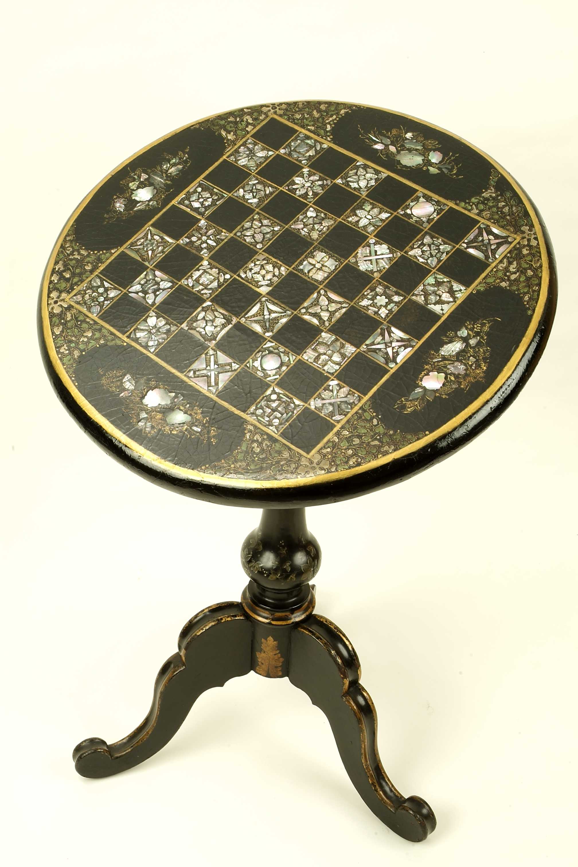 ![]() Cliché Patrick A.MARTIN Guéridon à damier/atelier Adt circa 1890-1900/inv. 01.81.13 dim. H. 75 - D. 60 | Les guéridons basculants sont souvent de fabrication très soignée. Leurs décors, surtout, reçoivent toutes les attentions. En effet, ils servaient de tables d'appoint lors de quelques occasions seulement ; la plupart du temps ils étaient disposés à la verticale, prenant ainsi moins de place tout en restant disponibles. De ce fait, ils présentaient un décor à la mode : château moyenâgeux, de fantaisie... Si le décor n'est qu'un simple damier, alors il est de nacre.