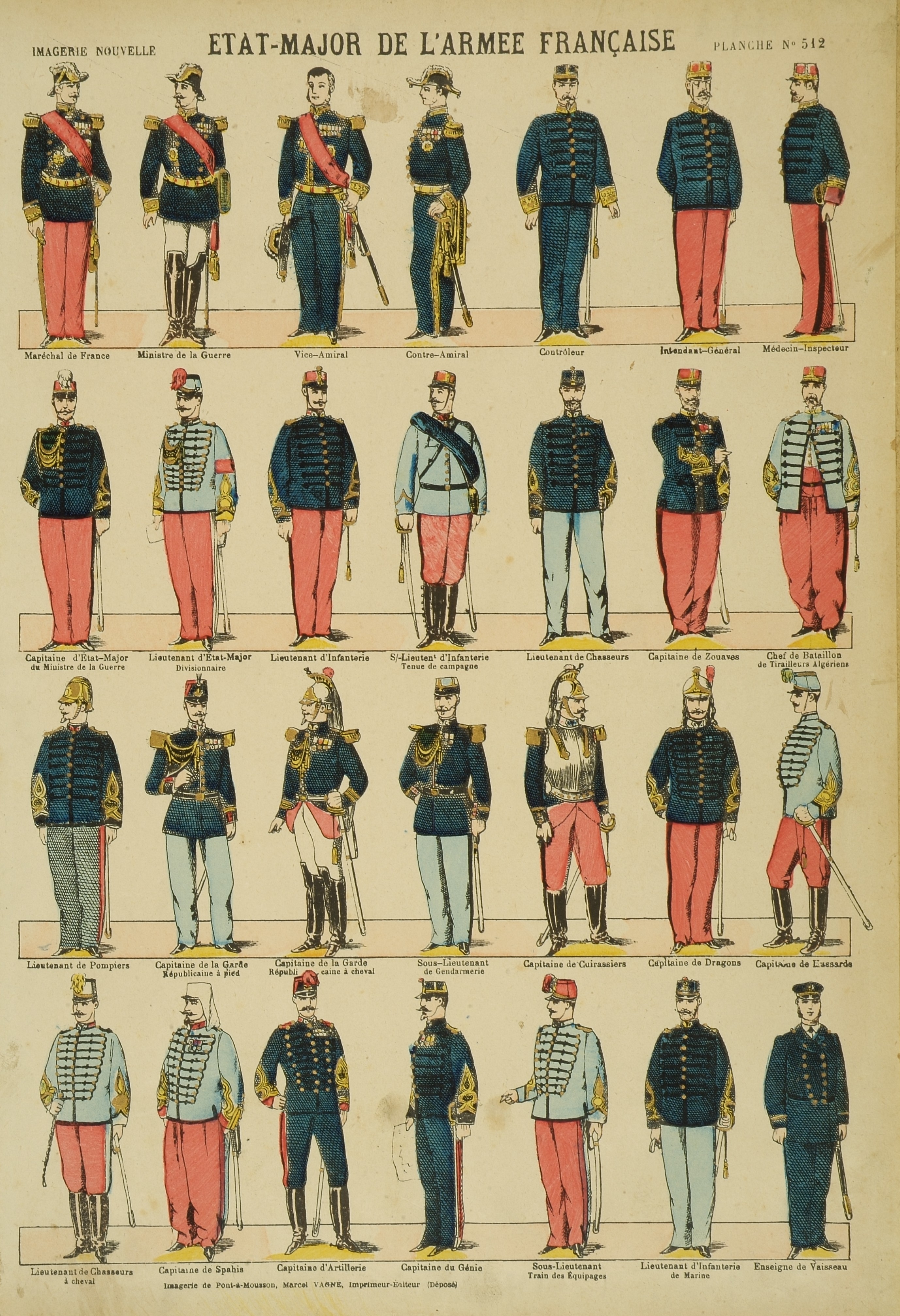 ![]() Cliché Patrick A. MARTIN Uniformes de l'Etat-Major de l'Armée française | Nombreuses dans la production de l'imagerie mussipontaine, les planches montrant les soldats sont souvent très raffinées et présentent force détails.